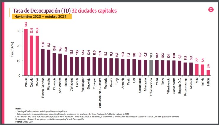 Sin embargo, al comparar las cifras con otras ciudades capitales, se observa que los municipios que encabezan la lista con mayor tasa de desempleo son significativamente más pequeños y con economías menos dinámicas. Entre estas ciudades se encuentran Arauca, Quibdó, Mocoa, Puerto Carreño, Riohacha, Florencia y San Andrés. De estas, la ciudad más grande es Riohacha, que tiene una población de aproximadamente 220,000 habitantes, una cifra que representa menos de un tercio de la población de Ibagué.