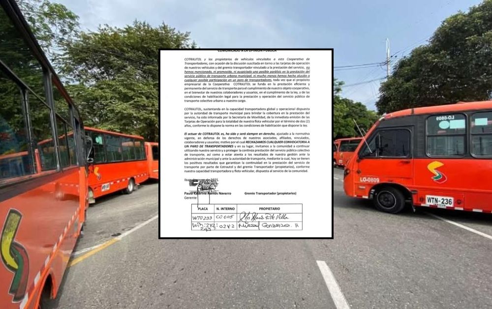 «No hemos mencionado, ni promovido, ni auspiciado una posible parálisis en la prestación del servicio público de transporte urbano municipal, ni mucho menos hemos hecho alusión a cualquier posible participación en un paro de transportadores, toda vez que el propósito empresarial de la Cooperativa COTRAUTOL se funda en la prestación eficiente y permanente del servicio de transporte para el cumplimiento de nuestro objeto cooperativo, en el bienestar de nuestros colaboradores y usuarios, en el cumplimiento de la ley, y de las condiciones de habilitación legal para la prestación y operación del servicio público de transporte colectivo urbano a nuestro cargo«, señalaron desde la compañía.