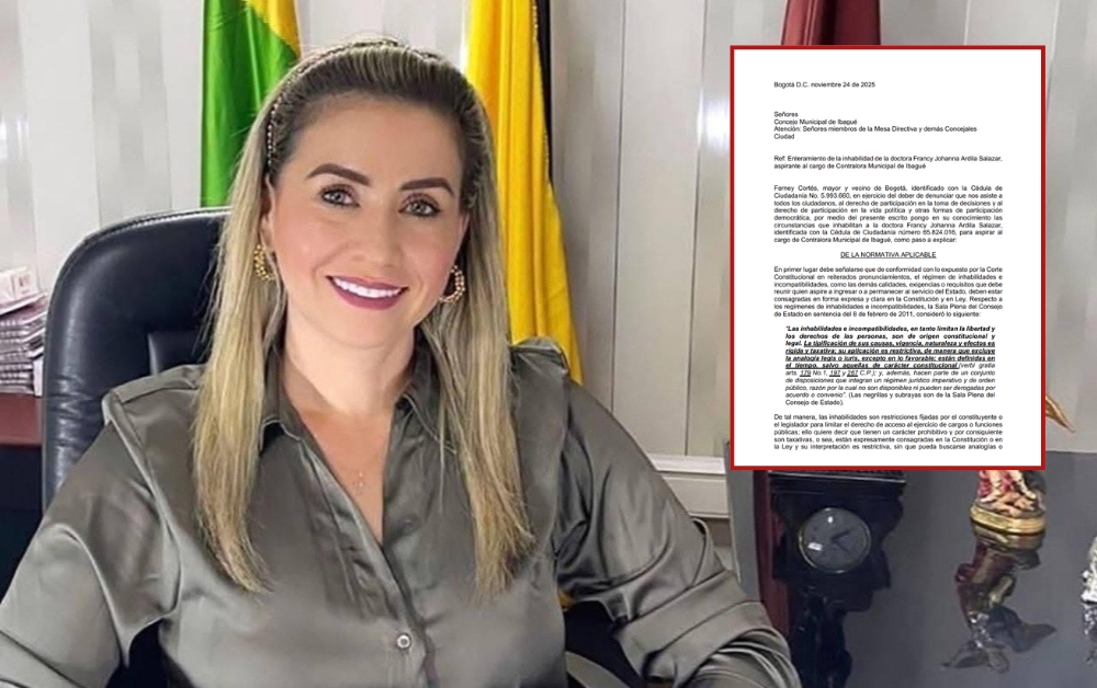 Ante la Mesa Directiva y los concejales de Ibagué fue radicada una denuncia que señala que Francy Johanna Ardila Salazar estaría incursa en una presunta inhabilidad para ocupar el cargo de contralora municipal. El escrito, presentado por el ciudadano Ferney Cortés, expone que la aspirante habría firmado contratos con una entidad pública dentro del año previo a la convocatoria del proceso, lo que según el denunciante contravendría la normativa vigente.