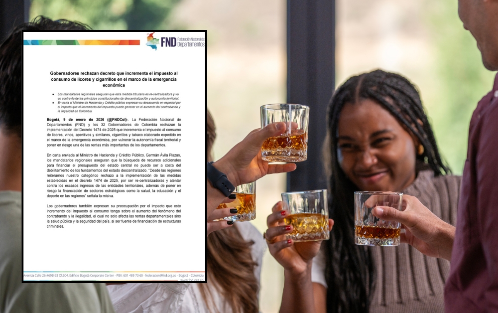 Los 32 gobernadores del país, representados por la Federación Nacional de Departamentos (FND), expresaron su firme oposición al Decreto Legislativo 1474 de 2025, emitido por el Ministerio de Hacienda y Crédito Público, que incrementa el impuesto al consumo de licores, vinos, aperitivos, cigarrillos y tabaco elaborado, argumentando que esta medida atenta contra la autonomía territorial y pone en riesgo las finanzas regionales destinadas a sectores clave como salud, educación y deporte.