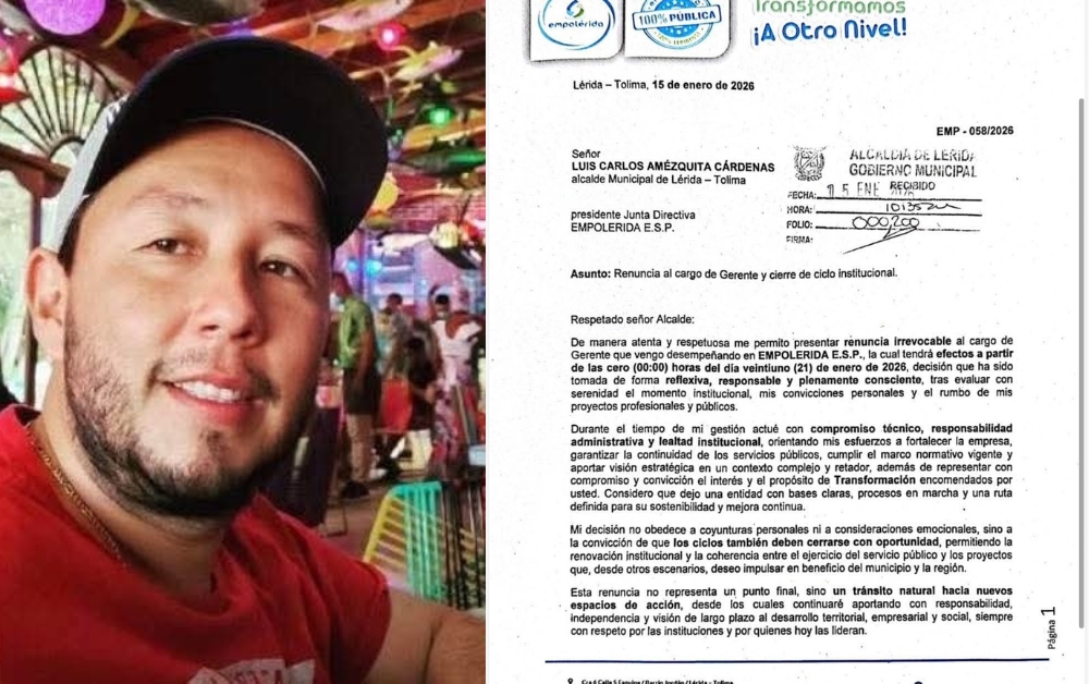 La renuncia fue formalizada mediante un documento radicado el 15 de enero ante la Alcaldía de Lérida y la Junta Directiva de la empresa, presidida por el alcalde municipal, Luis Carlos Amézquita Cárdenas. En el oficio se establece que, hasta la fecha efectiva de su retiro, Ortiz Céspedes continuará ejerciendo sus funciones con normalidad.