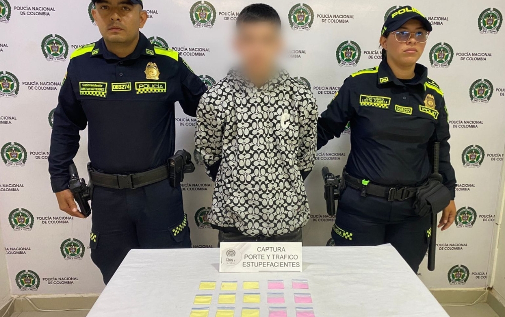 Durante la requisa, se encontró una bolsa plástica hermética en la pretina de su pantalón, la cual contenía 18 dosis de tusi de diferentes colores, una droga sintética de alto riesgo que se ha venido popularizando en entornos juveniles.