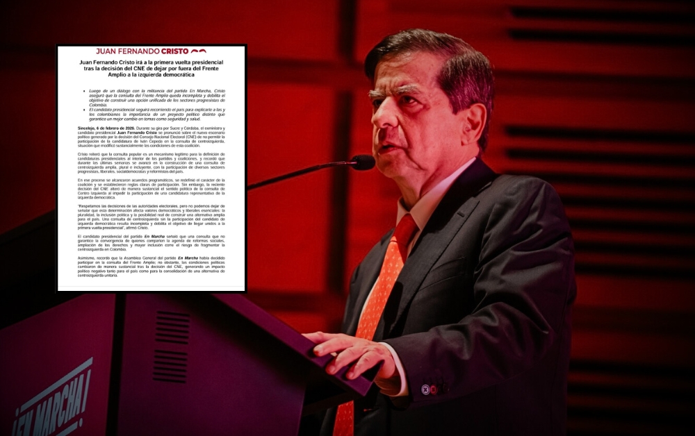 La contienda presidencial entra en una nueva fase luego de que el exministro Juan Fernando Cristo confirmara que no participará en la consulta del Frente Amplio y que continuará su aspiración presidencial de manera directa hacia la primera vuelta.