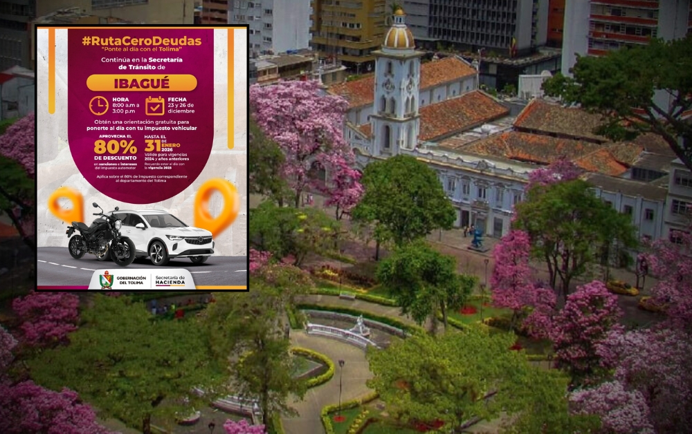 La Gobernación del Tolima, a través de la Secretaría de Hacienda, mantiene activa la estrategia #RutaCeroDeudas “Ponte al día con el Tolima”, con nuevas jornadas de atención en la Secretaría de Tránsito de Ibagué los días 23 y 26 de diciembre, en horario de 8:00 a. m. a 3:00 p. m.