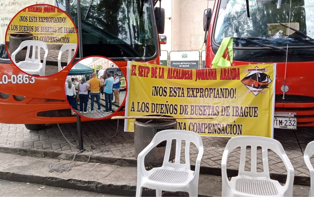 Nueve días completan los transportadores del servicio público de Ibagué encadenados a las busetas frente a la Alcaldía, en señal de protesta por lo que consideran una mala implementación del Sistema Estratégico de Transporte Público (SETP).